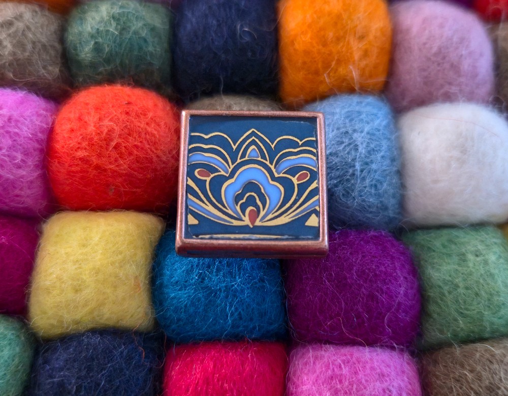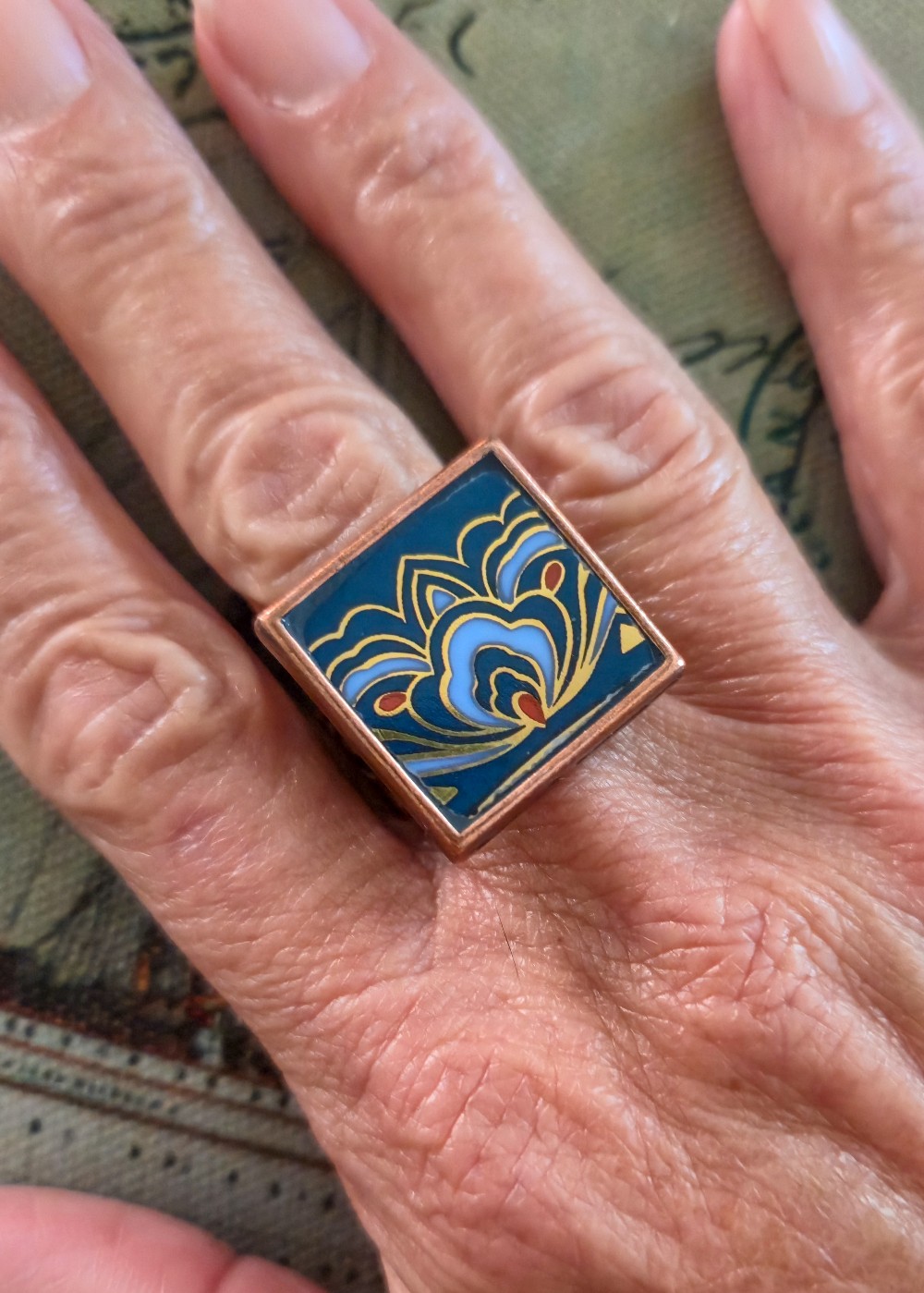 I have lovingly placed the porcelain piece into a square hammered antiqued copper adjustable ring bezel. The setting measures just over 3/4" square & it is adjustable to fit most any finger you might like to adorn with it!