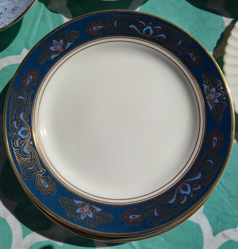 This beautiful vintage china adjustable ring has been created from a bread plate in this fabulous pattern “River Oaks” by Viletta, which features a royal blue band with gold scrollwork décor & rings + red accents that I just knew would make some stunning jewelry pieces ~ I hope you agree! The production period for this lovely pattern was 1986 – 1996.