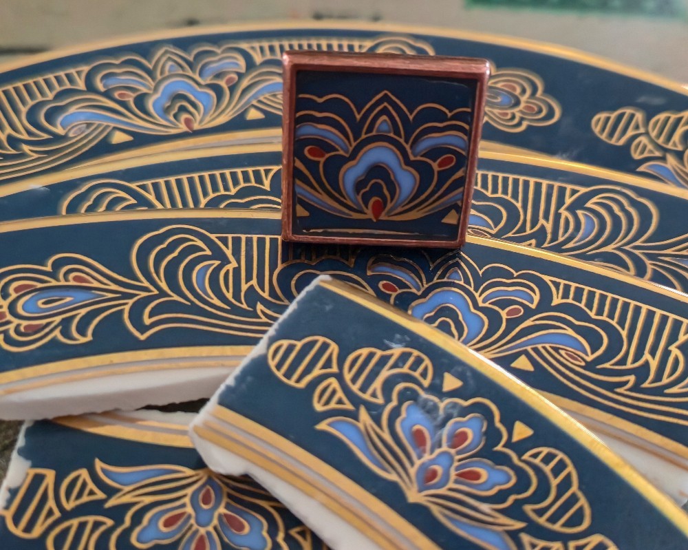 The design for this stunning ring was chosen & cut out with ceramic tile nippers, smoothed out to size & shape with my handy dandy grinder, then (black) grout is added to the edges to seal & further protect the vintage china.