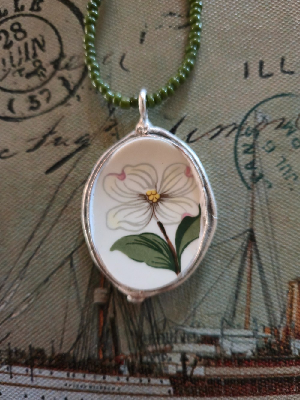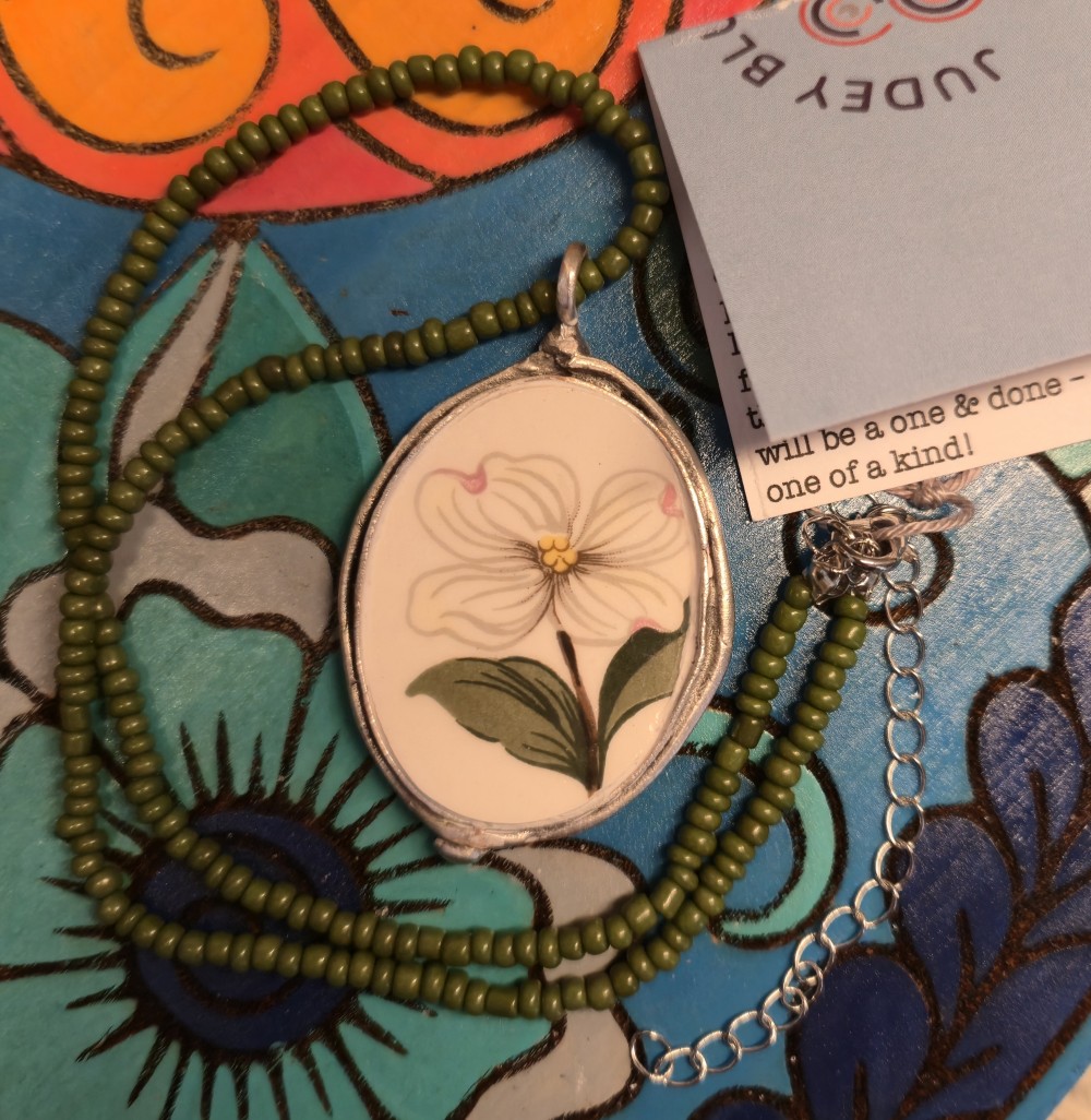 This gorgeous & totally fabulous antiqued silver pendant was created out of a salad plate from Homer Laughlin's "Dogwood" pattern which features a classic mid-century modern style with stunning white dogwood flowers, green leaves & brown stalks with a gold trim. They were part of the Homer Laughlin Debutante line which was produced in 1950. This is a friend's pattern ~ she had a mishap & brought me enough of the shattered pieces to create a pendant for her & just enough leftover to create this beauty for you! Unless I find more of these plates in my travels, it will be a one & done one of a kind!