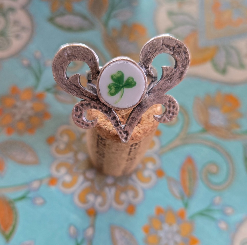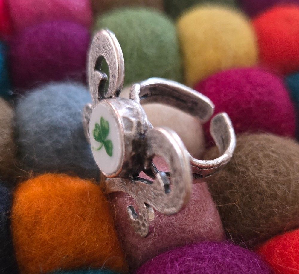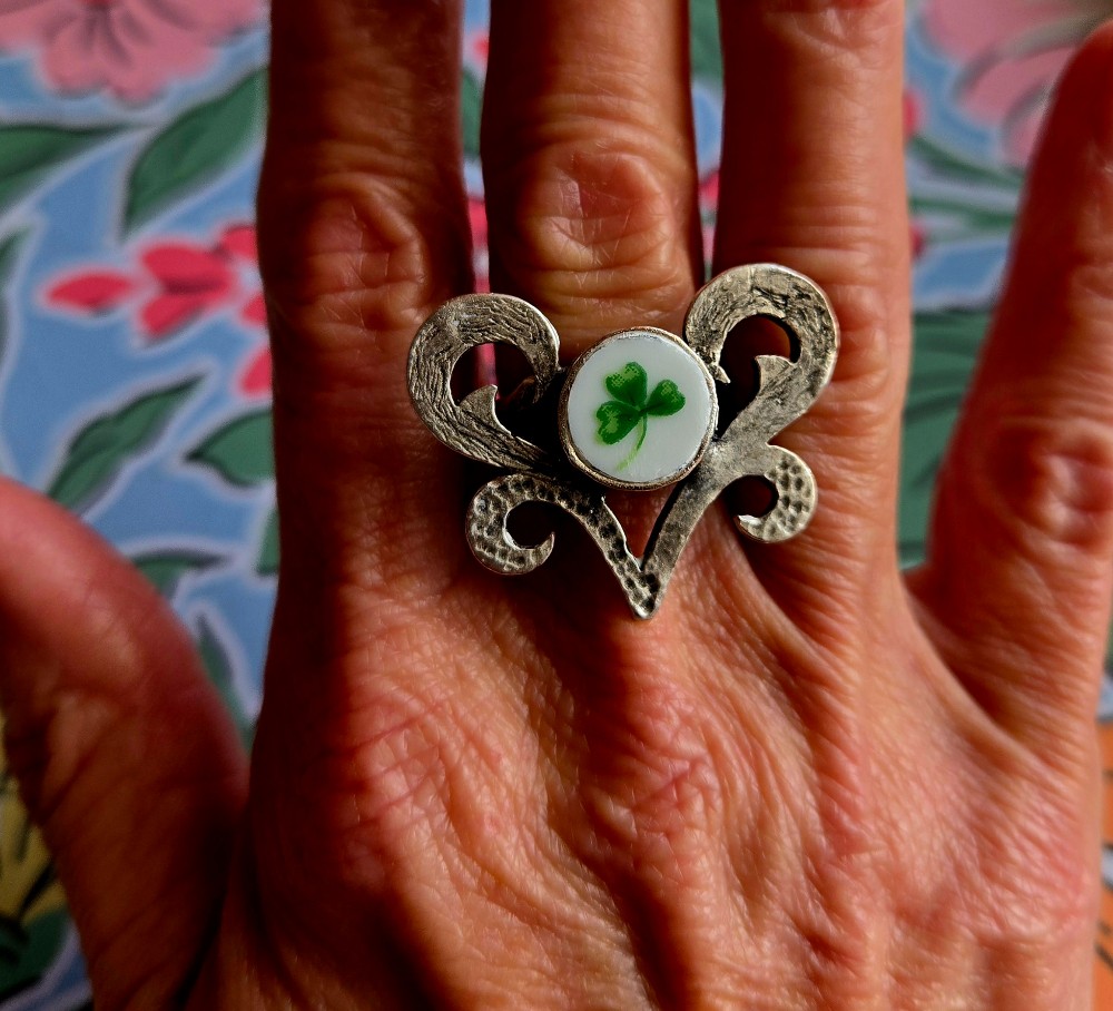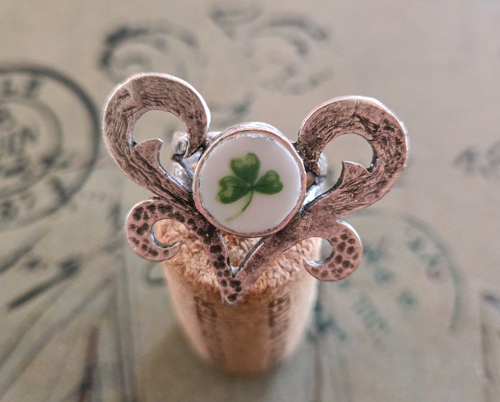 This fabulously fun & lucky adjustable ring was created from a vintage Lefton China porcelain plate pattern that features hand-painted shamrocks & clovers pattern aptly called "Shamrock St. Patrick", which was produced in Japan starting in 1987 until the Lefton family sold the company in 2001. For this pendant, I captured one of those lucky clovers/shamrocks for you to enjoy!