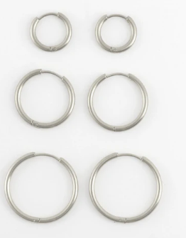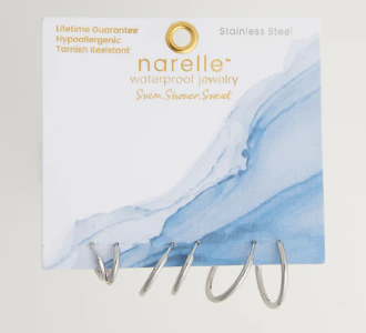 Chic and understated, the Narelle Waterproof Classic Hoop Earring Trio offers three pairs of earrings in three sizes of hoops each in a classic, goes-with-everything silver. Go big and bold, or keep it tiny and minimalistic, the options are endless with this versatile set! Waterproof , stainless steel plated and made with a specialized PVD technique to withstand the rigors of life, from swimming and showering to sweating through your most intense workouts, all without ever losing its shine.