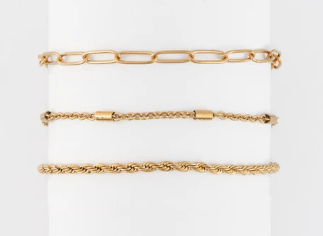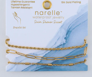 A modern take on classic designs! The Narelle Waterproof Twisted Chain Bracelet Set offers three golden bracelets in trendy Paper Clip, Twist, and Dainty Chain designs. Wear them together as part of a stack, or on their own for a delicate, minimalist look. They styling options are endless! Waterproof , 18K gold plated and made with a specialized PVD technique to withstand the rigors of life, from swimming and showering to sweating through your most intense workouts, all without ever losing its shine.