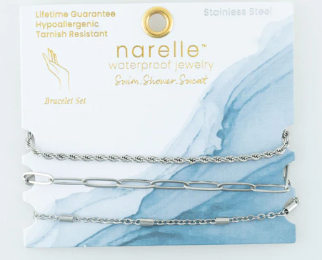 A modern take on classic designs! The Narelle Waterproof Twisted Chain Bracelet See offers three silver bracelets in trendy Paper Clip, Twist, and Dainty Chain designs. Wear them together as part of a stack, or on their own for a delicate, minimalist look. They styling options are endless! Waterproof , stainless steel plated and made with a specialized PVD technique to withstand the rigors of life, from swimming and showering to sweating through your most intense workouts, all without ever losing its shine.