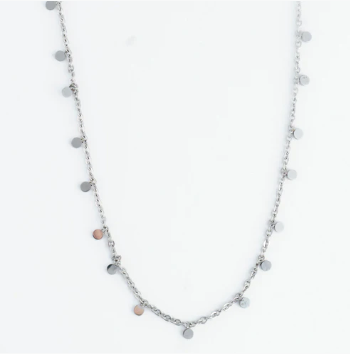 A modern take on a classic, the Narelle Waterproof Disc Chain Necklace offers a singular delicate chain with cute disc detailing and in a classic silver. Designed to create an effortlessly chic and minimalist look, this sweet waterproof necklace is the perfect finishing touch. Waterproof , stainless steel plated and made with a specialized PVD technique to withstand the rigors of life, from swimming and showering to sweating through your most intense workouts, all without ever losing its shine.