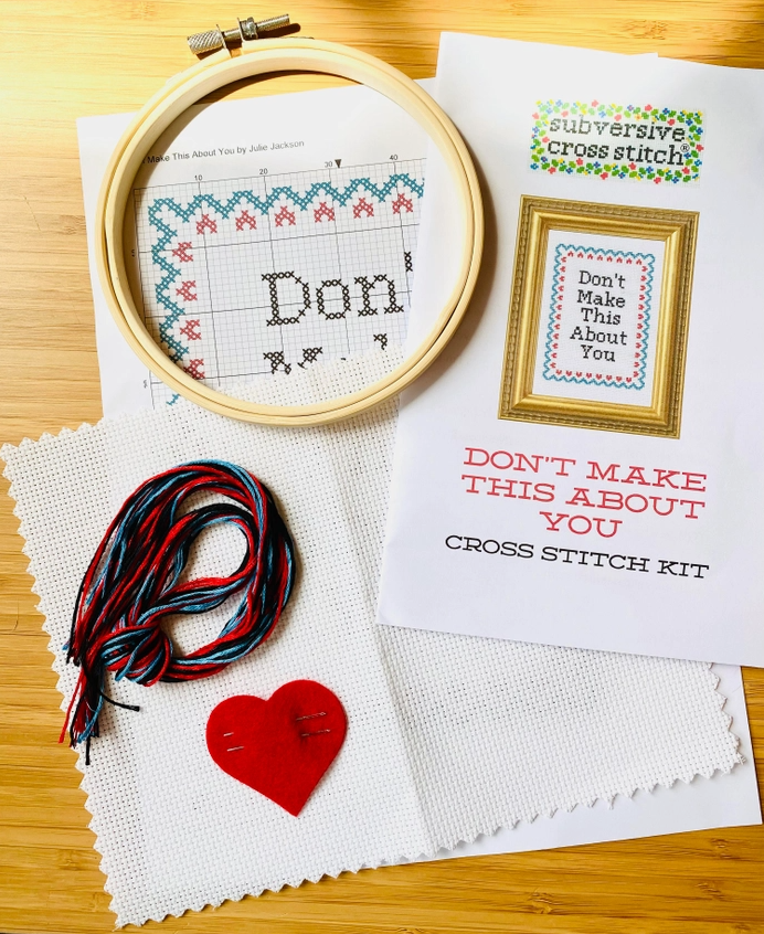 Don't EVEN go there! Deluxe kit includes material, thread, full color pattern, instructions, two needles and a hoop. Kit photos are an example of packaging and kit contents but will come with pattern in main photo. Design area size on 14-count material: 5" x 3.79". Frame not included.